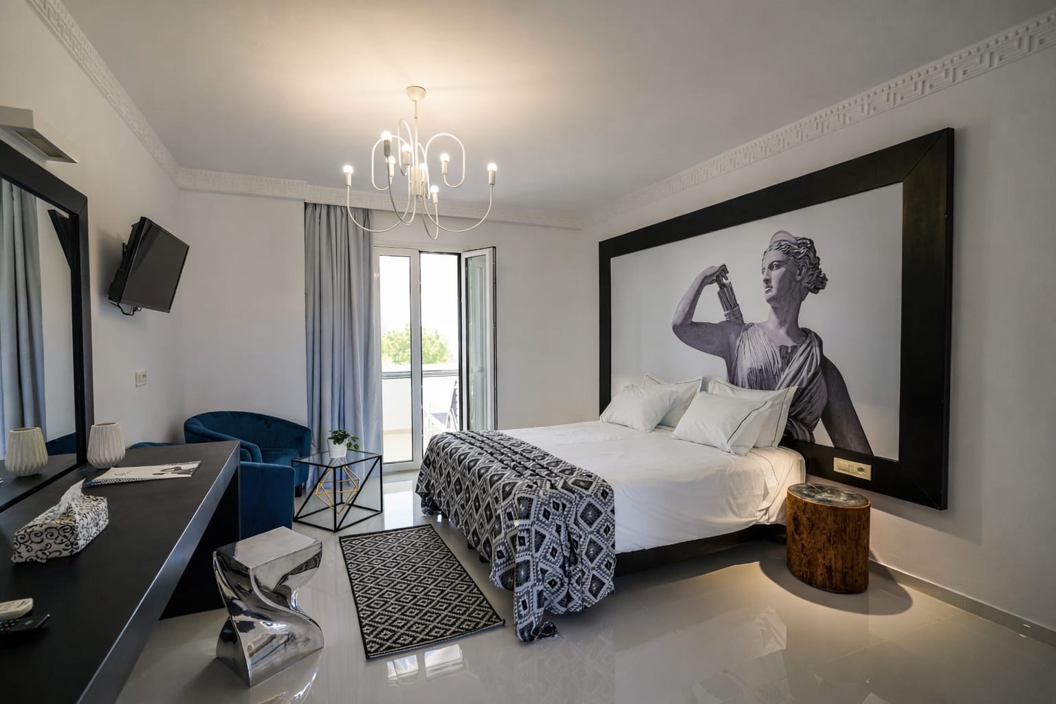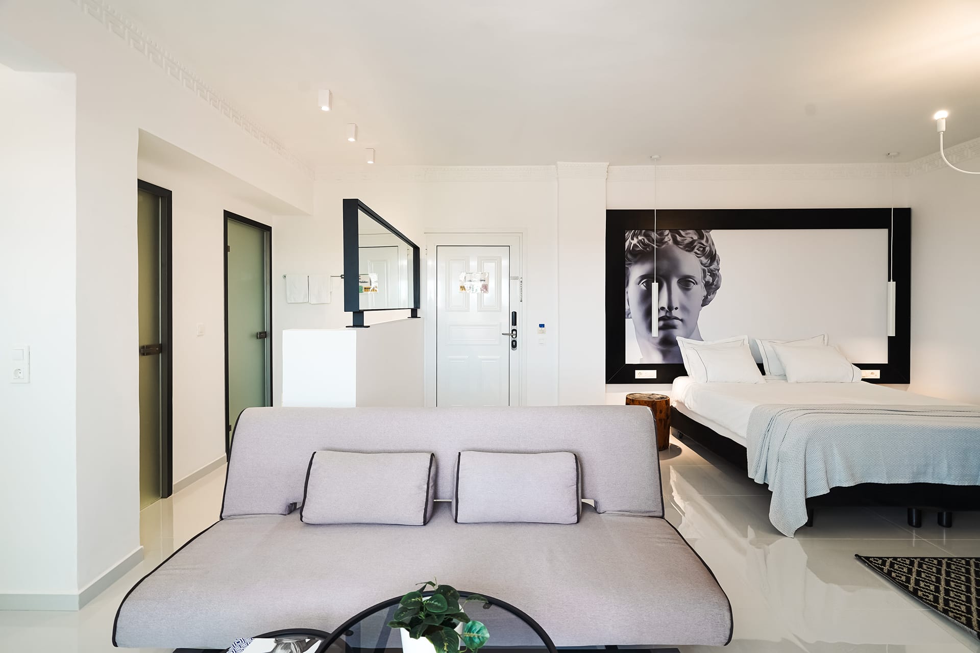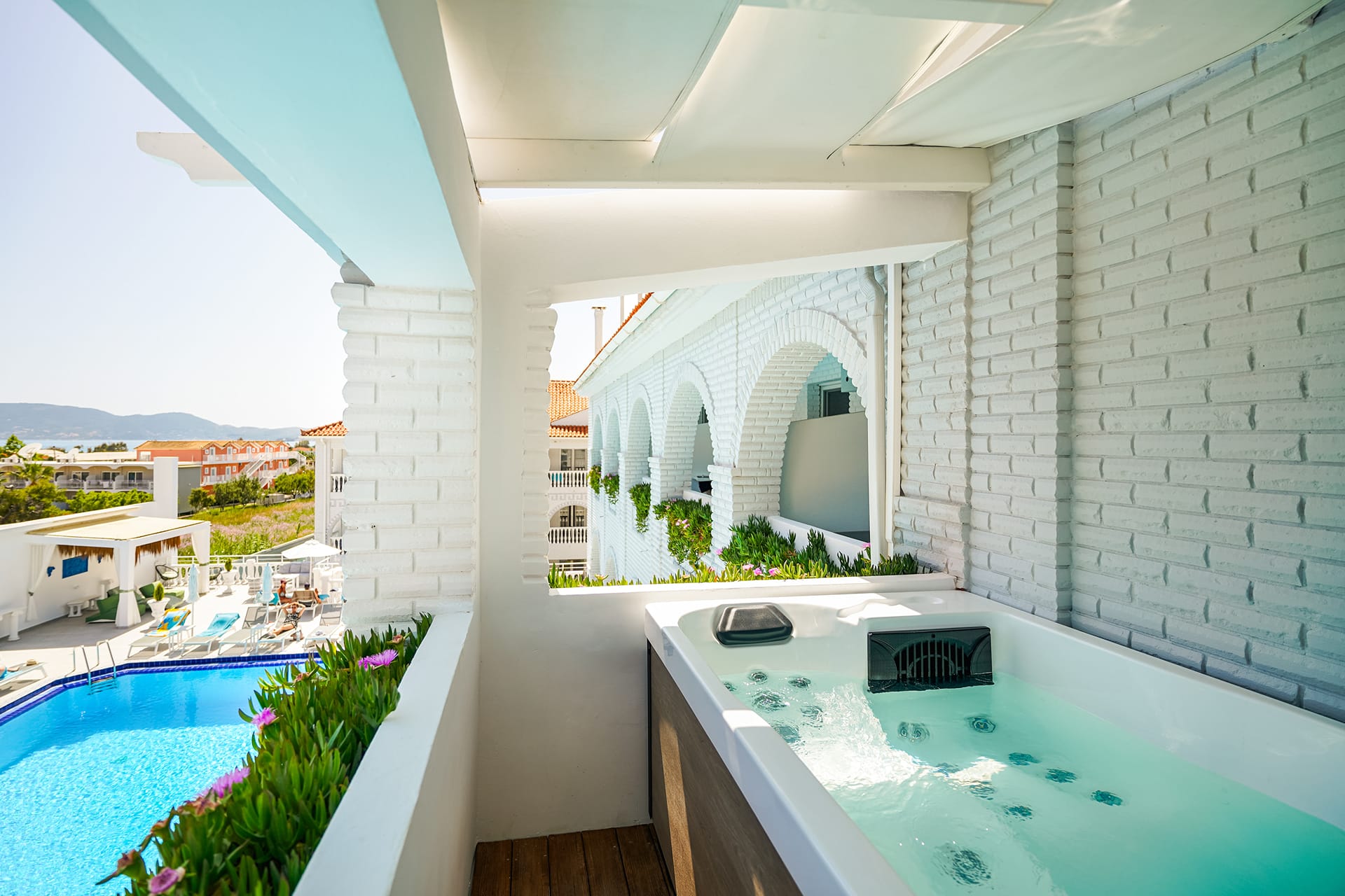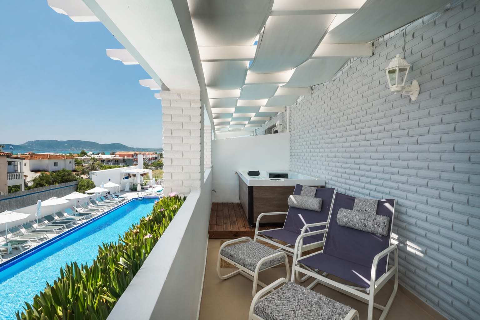 Overlooking the Ionian Sea & Marathonisi island, Superior Suite with Private Jacuzzi combines a relaxing holiday experience with comfort, luxury, and a style of simplicity inspired by Greek Mythology. Featuring a modern open plan interior, combined with an unforgettable relaxing Jacuzzi experience makes it a perfect choice for a romantic getaway. The room consists of one queen size bed & one sofa bed, or two armchairs.